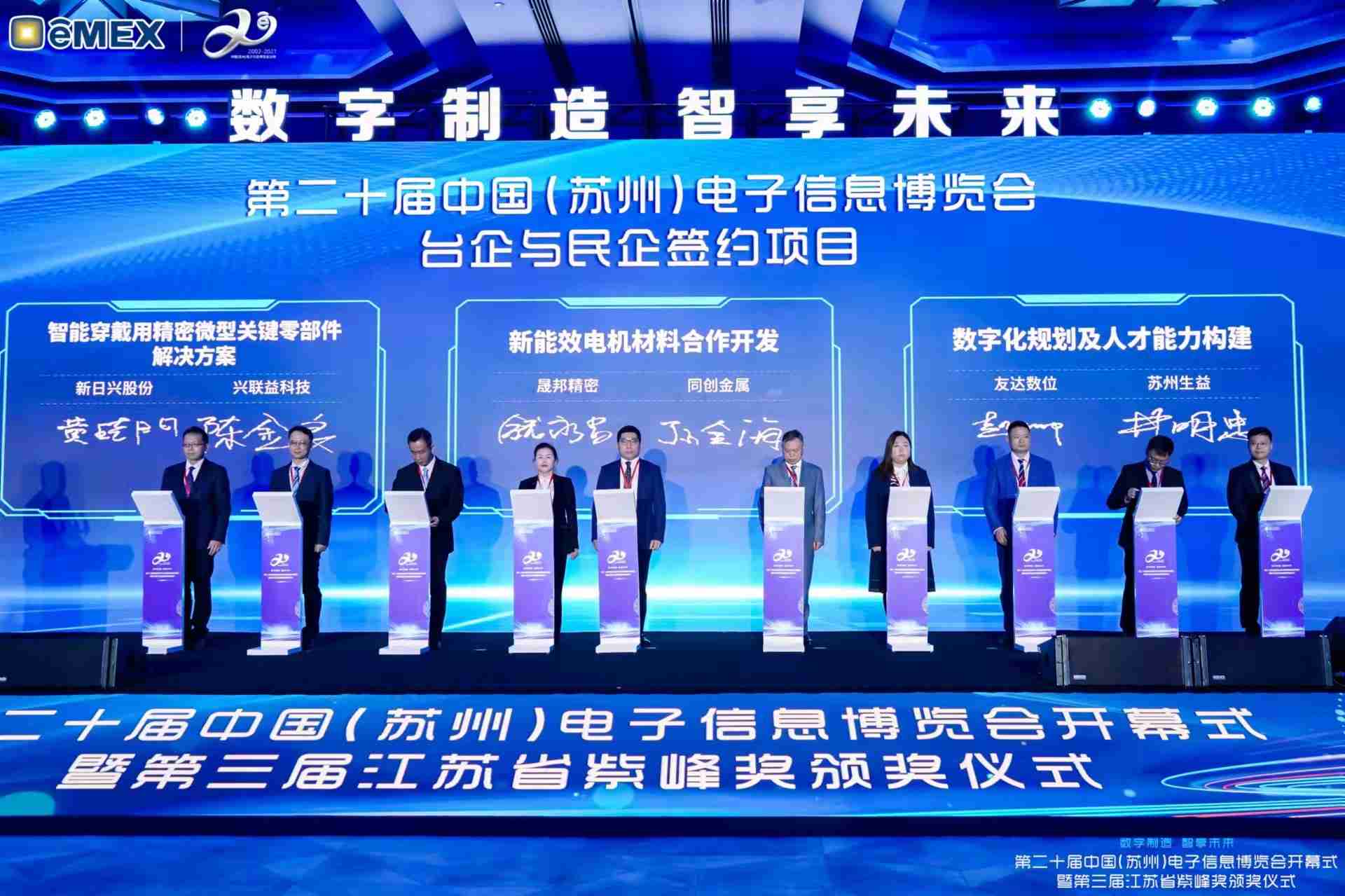 电博会开幕式当天也是第三届江苏省紫峰奖颁奖仪式,,,省台办、、、、工信厅、、、商务厅、、苏州市相关领导均出席并颁奖。。。。该奖项为表彰对江苏高质量发展做出积极贡献的在苏企业,,,,由江苏省政府专门设立。。万利光电 (苏州) 总经理郭振明代表上台领奖,,这也是万利苏州连续三次蝉联紫峰奖 出口贸易领军企业奖。。万利数位总经理赵丽娜女士,,,,也参与本次开幕式,,,,上台为本地化赋能签署战略合作协议,,,,将优质服务资源集合、、、下沉到更多细分行业,,,,为更多地区的制造企业提供数字化转型服务。。。。